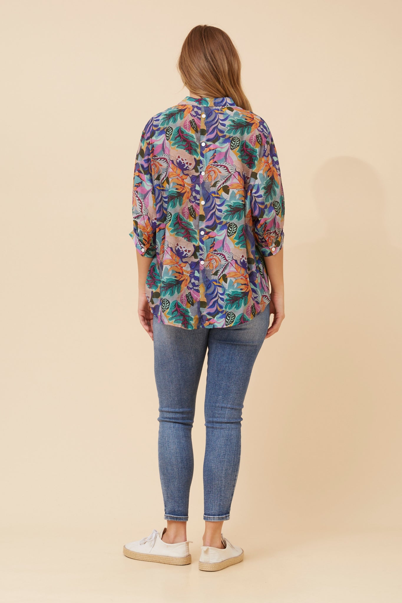 Breezy and feminine, the Caroline K Morgan Belina Shirt is the perfect blend of relaxed comfort and tropical charm. Crafted in a luxe silk-feel fabric, it features an open mandarin collar with functional front buttons, 3/4 balloon sleeves, and a curved hi-low hem for effortless styling. Back button details add a chic touch, while the vibrant tropical print makes it a standout piece for both casual and elevated looks. Designed with a generous fit for easy wear.