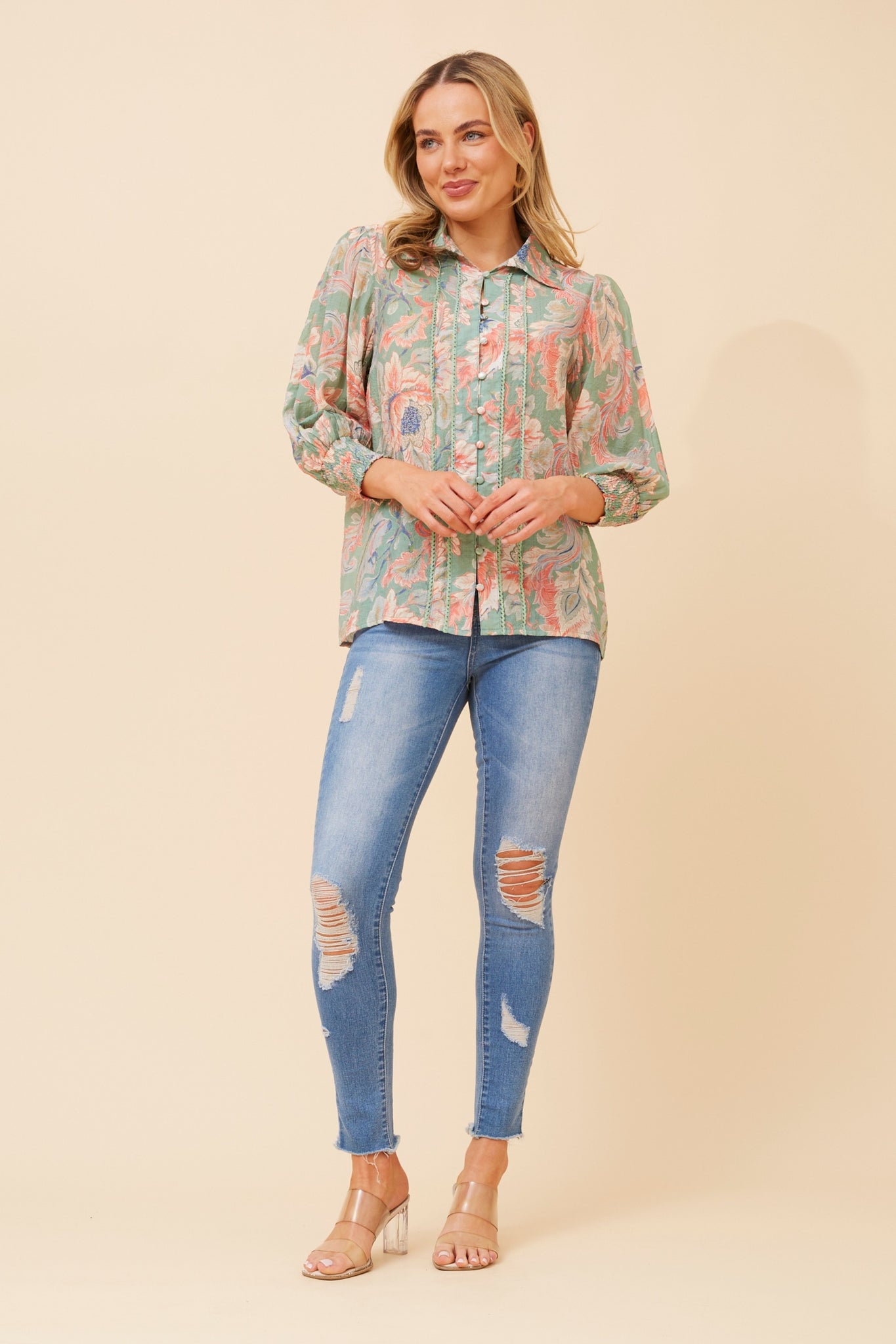 CKM Floral Print Blouse w Lace Trim Detail Avocado