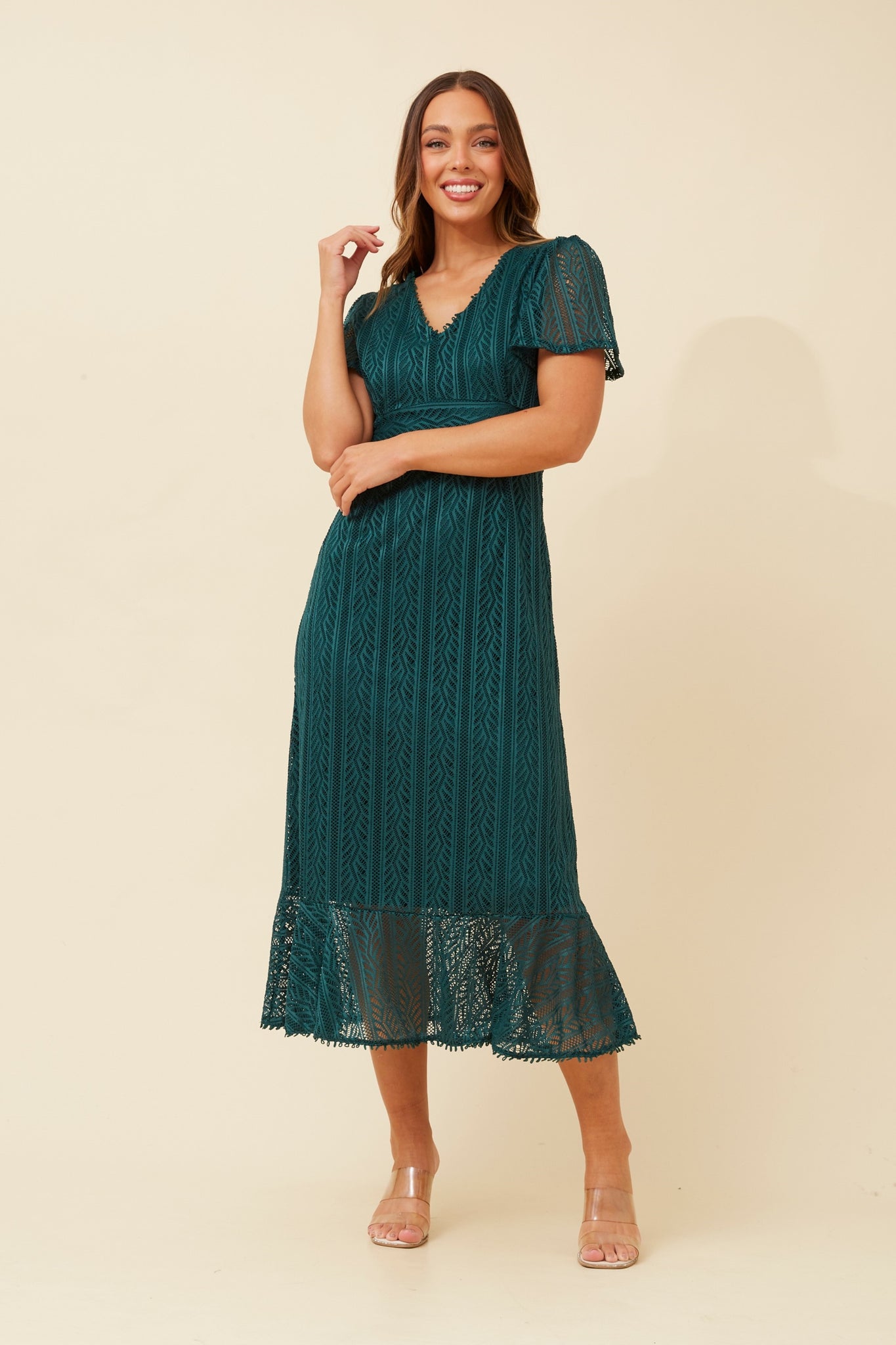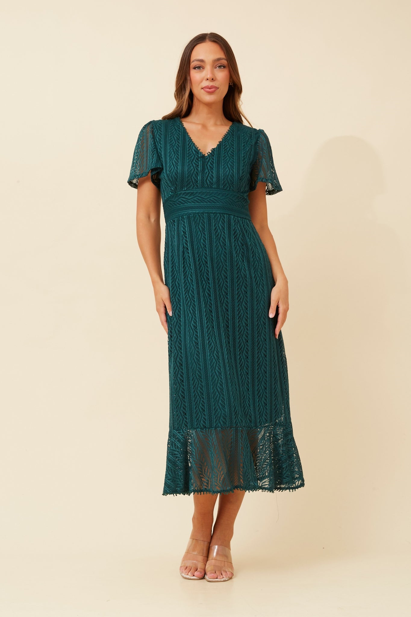 The Godiva Lace Midi Dress by Caroline K Morgan exudes timeless elegance and feminine charm. Featuring a flattering V-neckline, short sleeves, and a cinched waist, this beautifully fitted dress enhances your silhouette with effortless grace. The intricate lace overlay and midi length create a sophisticated finish, while a functional zip closure at the back ensures ease of wear. Partially lined for comfort and coverage, it’s the perfect choice for special occasions or an elevated day look.