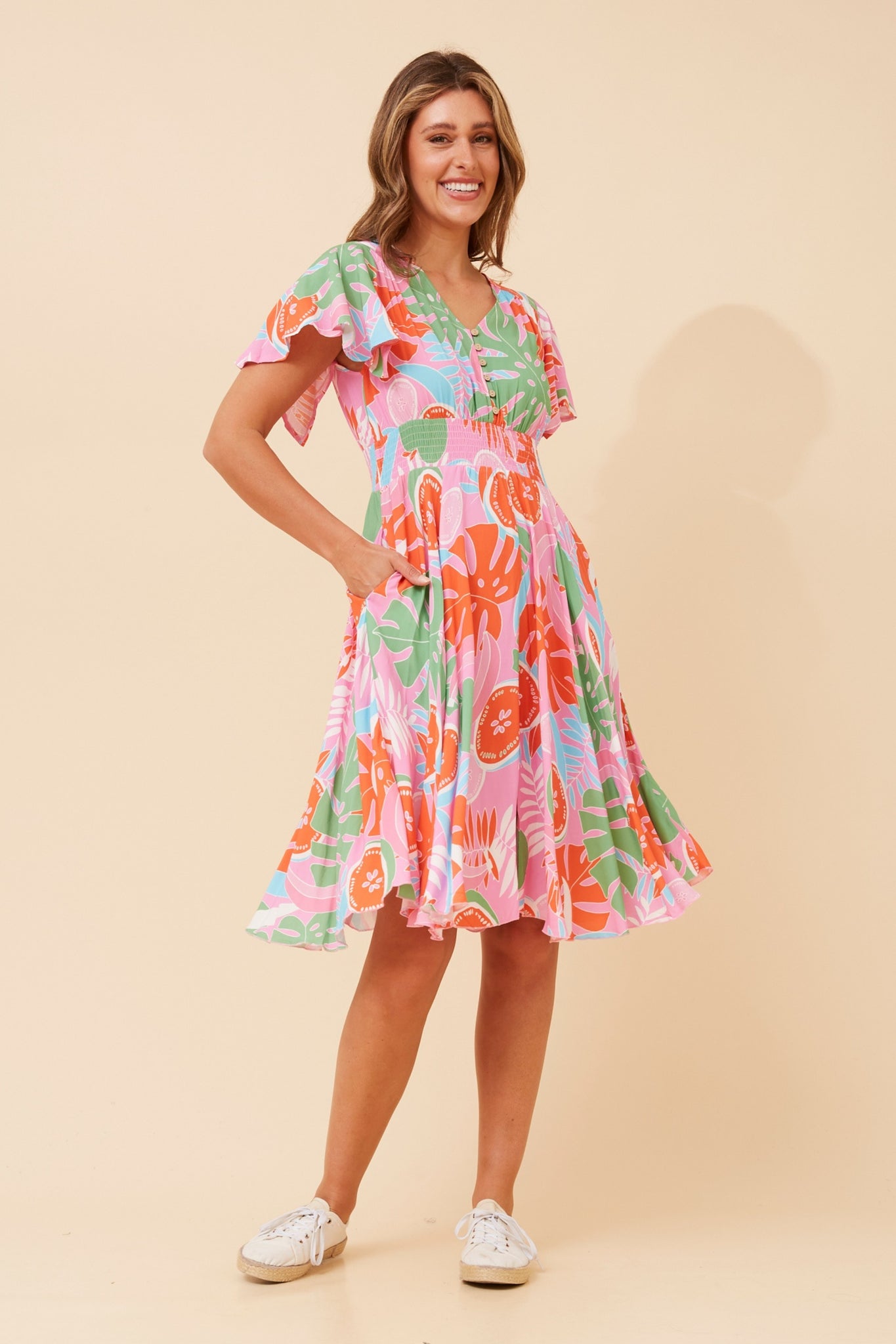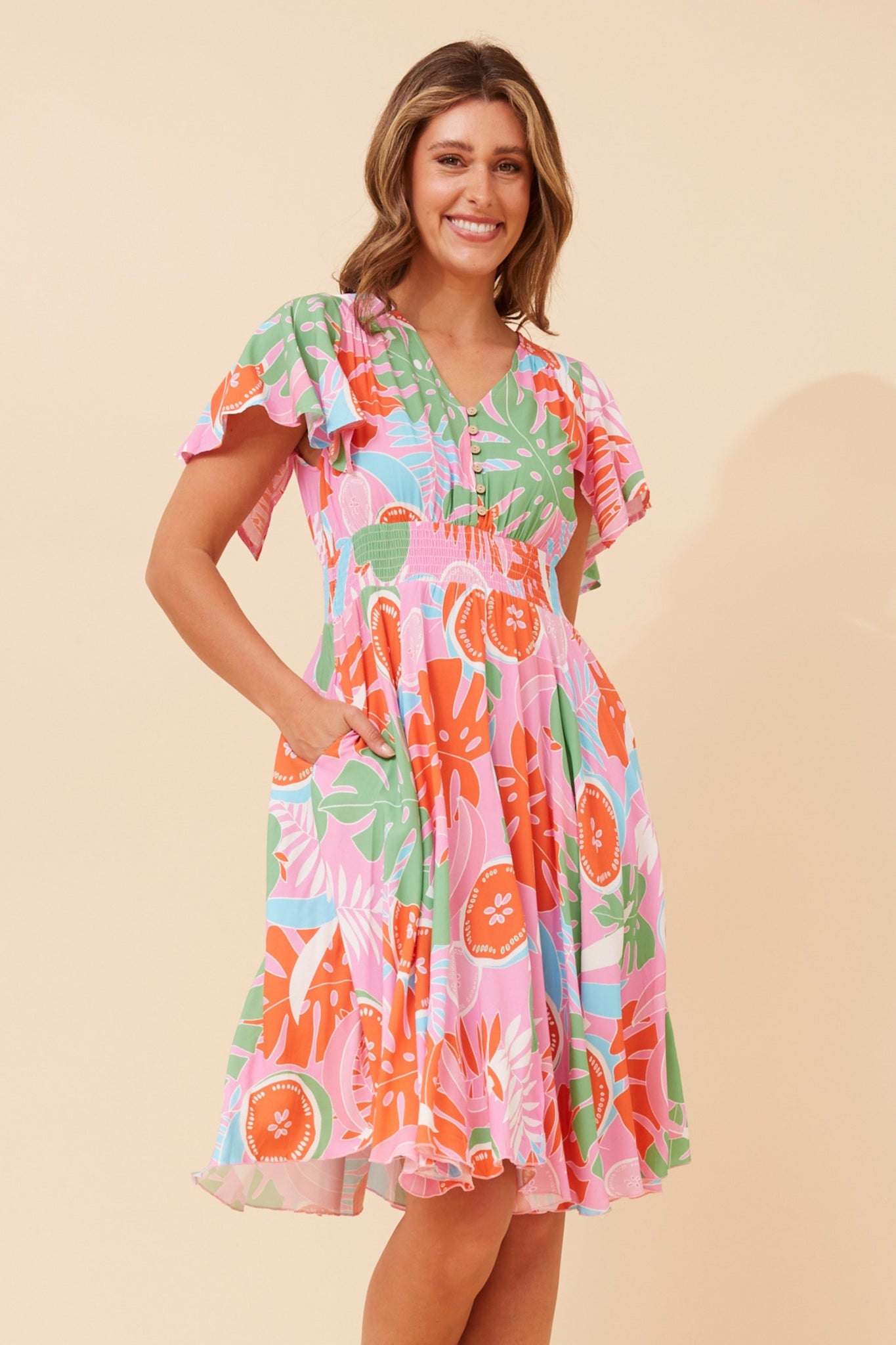 Feminine and fun, the Caroline K Morgan Ruffle Sleeve Button Front Dress is a must-have this season. Designed with a flattering v-neckline and delicate short ruffle sleeves, it brings effortless charm to any occasion. The front button detail and shirred waistband create a comfortable, figure-enhancing fit, while functional side pockets add everyday practicality.