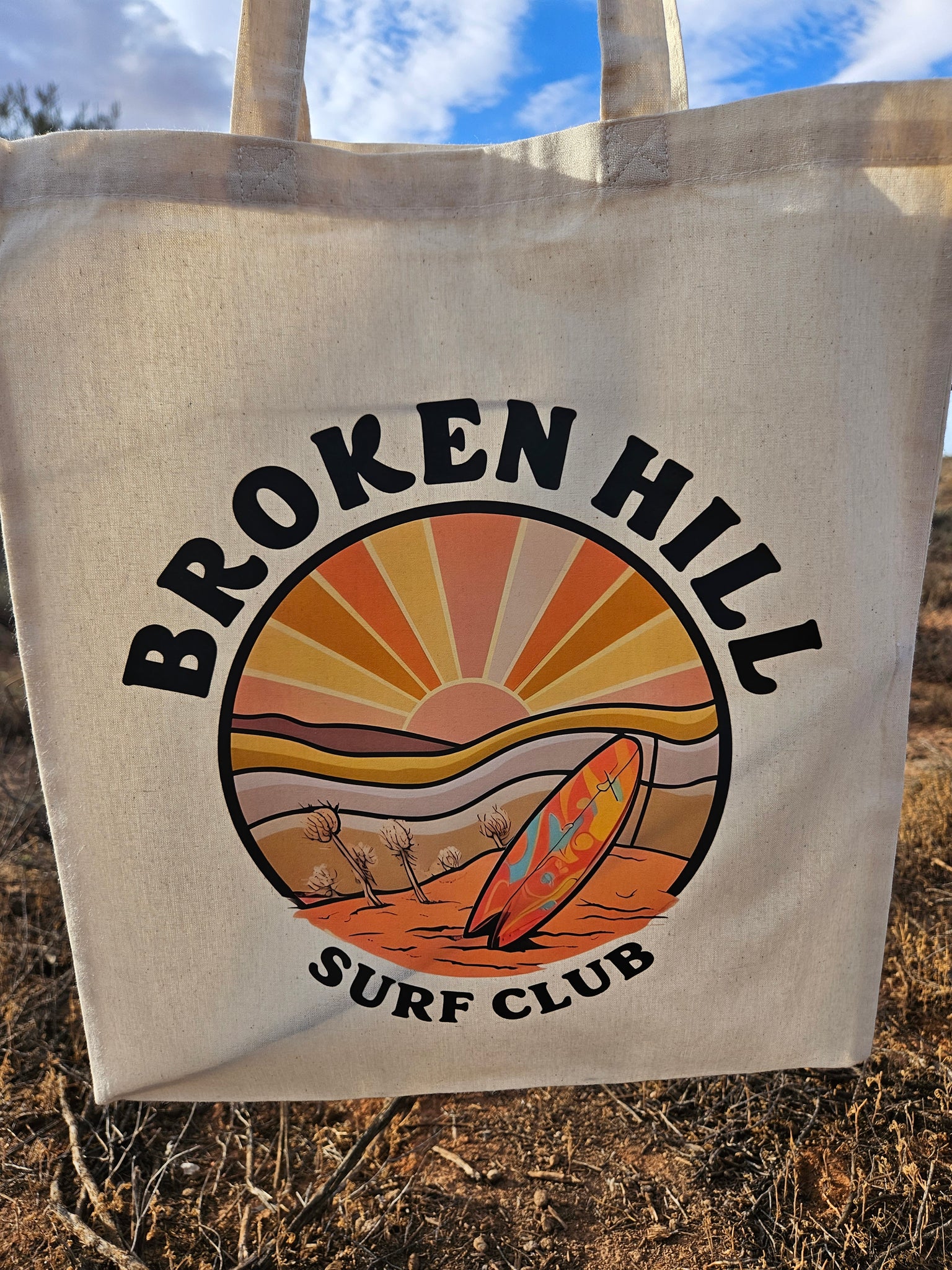 Make a splash… even in the desert. Our Broken Hill Surf Club Tote Bags are the perfect accessory for Australia’s most landlocked “surf club” — proudly designed and printed/pressed right here in Broken Hill. Whether you’re heading to the shops, the pub, or braving the treacherous waves of the local aquatic centre, this tote has your back.