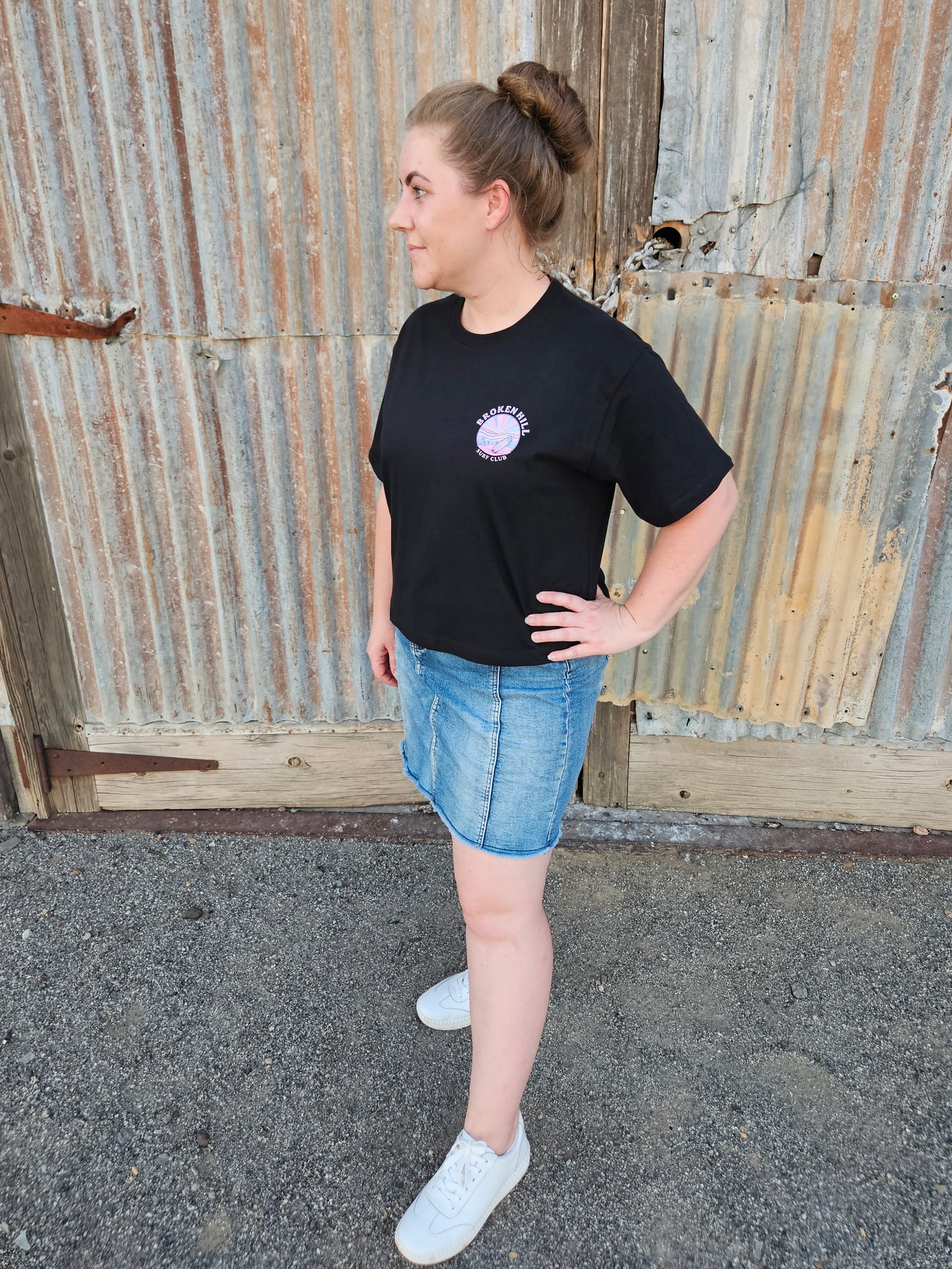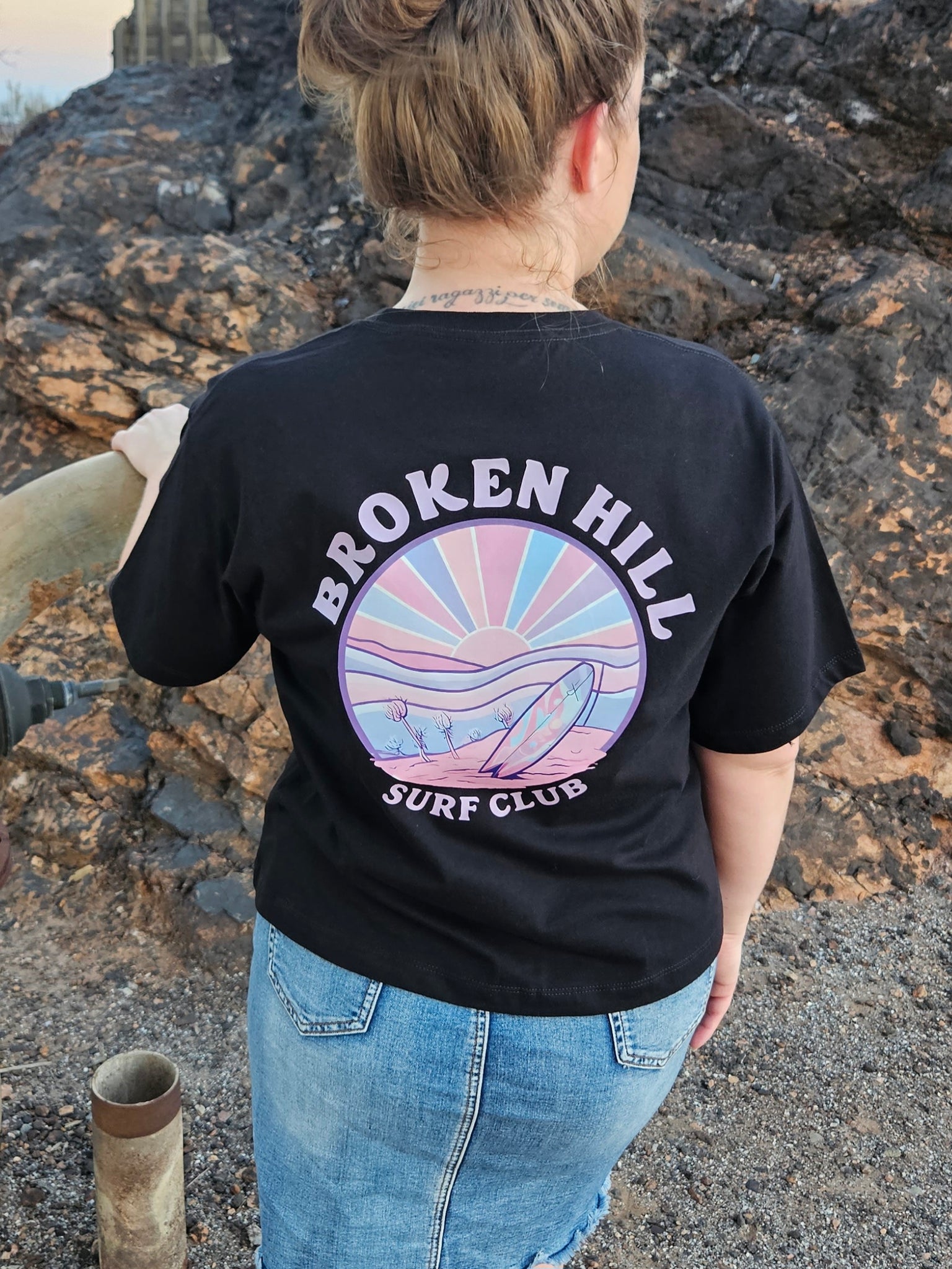 Our latest Broken Hill Surf Club release brings a little pastel punch to the desert. Featuring soft pastel pink tones in the logo, this beauty is printed on a classic black cropped tee — because even a parody surf club needs a cute option 😉
